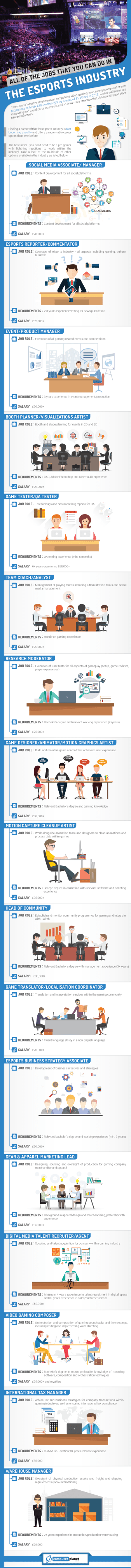 Aside from creating an industry that offers competitive salaries and the opportunity for international networking and travel, jobs within the eSports market offer a chance to work with the newest technology available. This modern job market offers new prospects for part-time and remote work and is suitable for fresh graduates, young professionals, working mothers and senior professionals alike. The below infographic from Computer Planet allows for quick oversight of some popular job types and associated salaries within the esports industry. It also provides an overview of the skills and experience that jobs within the industry require. This booming industry is ready to welcome aspiring professionals from every background.